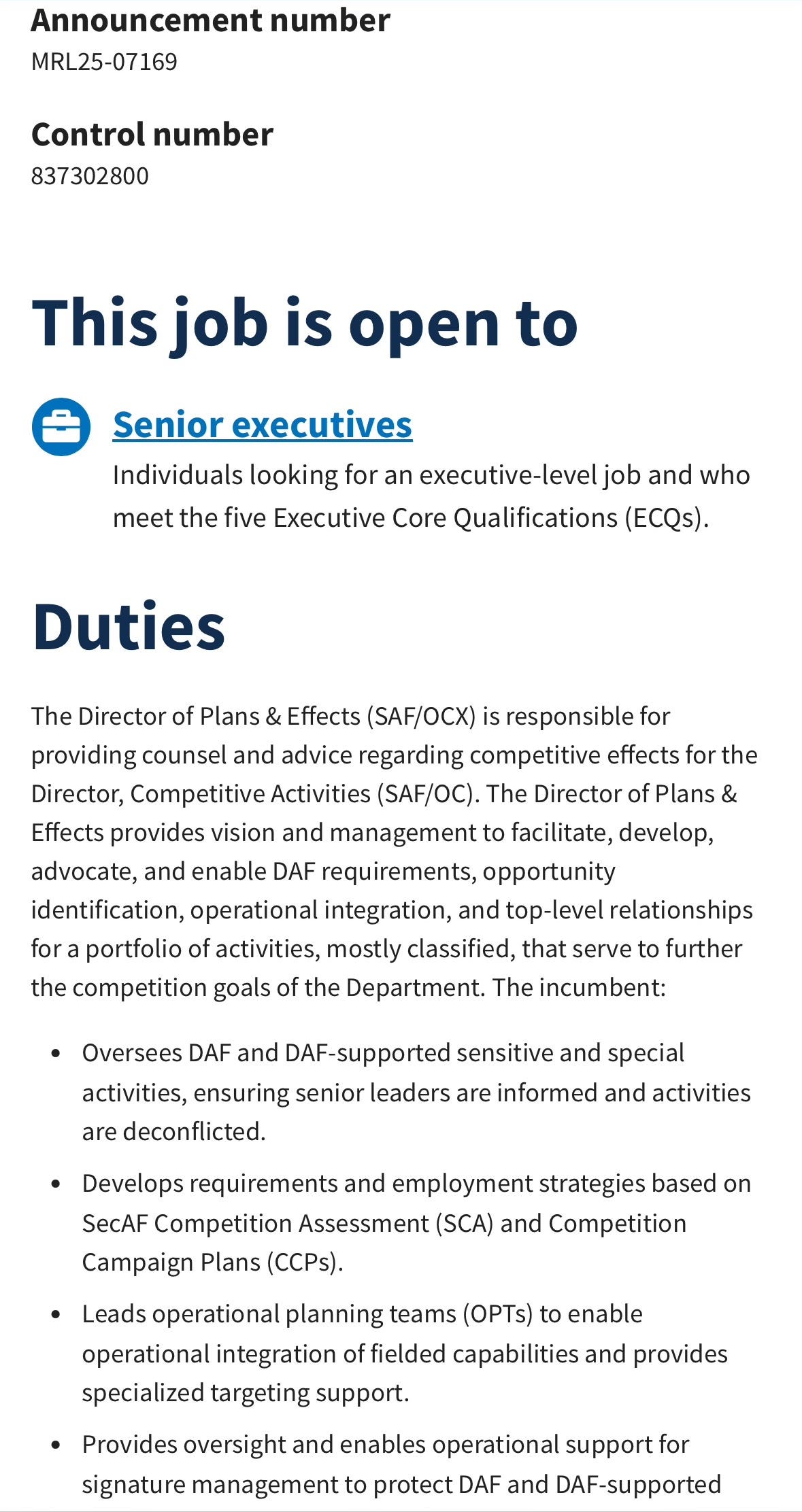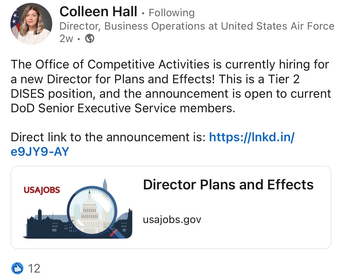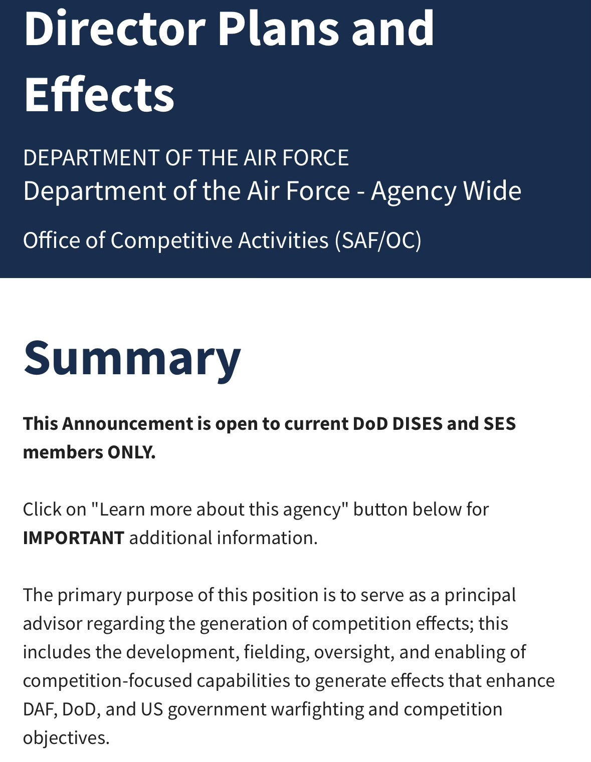 Somewhat ironically, the information that confirmed Wyler was an SES-2 seems to indicate that he is preparing to retire. In May 2025, Colleen Hall, the Director for AF Business Operations, made a post on her LinkedIn highlighting that Air Force was starting the process of hiring a new Director of Plans & Effects within the Office of Competitive Activities (Russell Wyler’s renamed job position as of December 2024). In the post, she says,