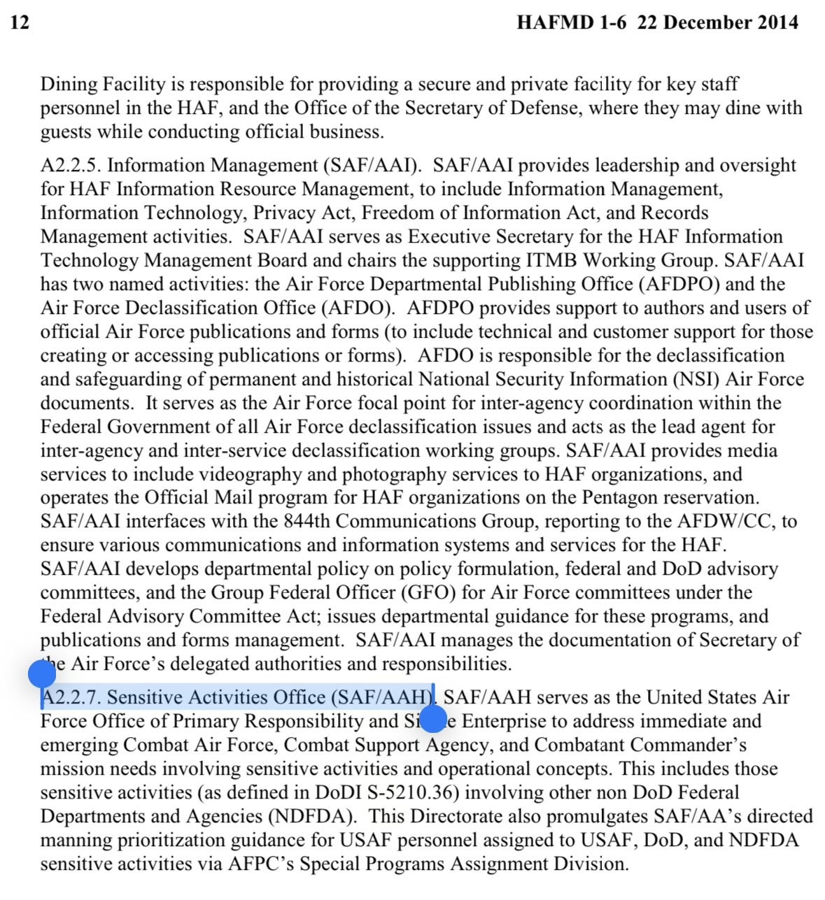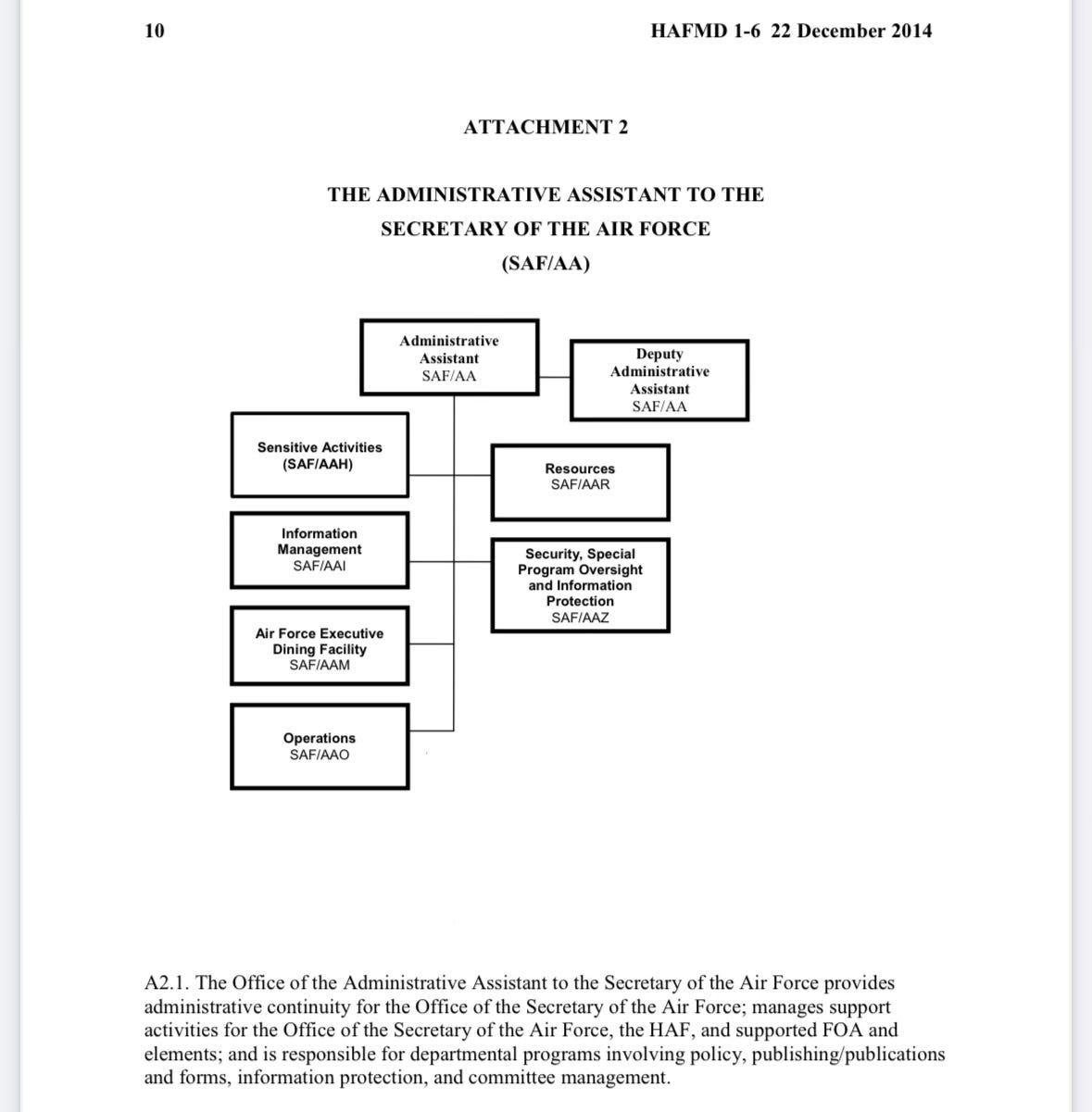 SAF/AAH, Director of Sensitive Activities, Admin. Asst. to SECAF (under the recent USAF restructuring, he is now “Director of Plans & Effects,” Office of Competitive Activities, but is still noted to be the POC for “sensitive activities.”)